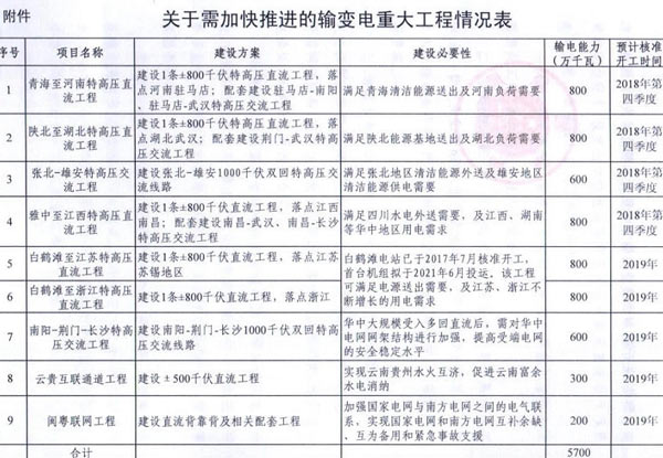 9月7日獲悉,國(guó)家能源局印發(fā)《關(guān)于加快推進(jìn)一批輸變電重點(diǎn)工程規(guī)劃建設(shè)工作的通知》國(guó)能發(fā)電力〔2018〕70號(hào),《通知》指出,為加大基礎(chǔ)設(shè)施領(lǐng)域補(bǔ)短板力度,發(fā)揮重點(diǎn)電網(wǎng)工程在優(yōu)化投資結(jié)構(gòu)、清潔能源消納、電力精準(zhǔn)扶貧等方面的重要作用,加快推進(jìn)青海至河南特高壓直流、白鶴灘至江蘇、白鶴灘至浙江特高壓直流等9項(xiàng)重點(diǎn)輸變電工程建設(shè),合計(jì)輸電能力5700萬(wàn)千瓦(工程見(jiàn)附件)。